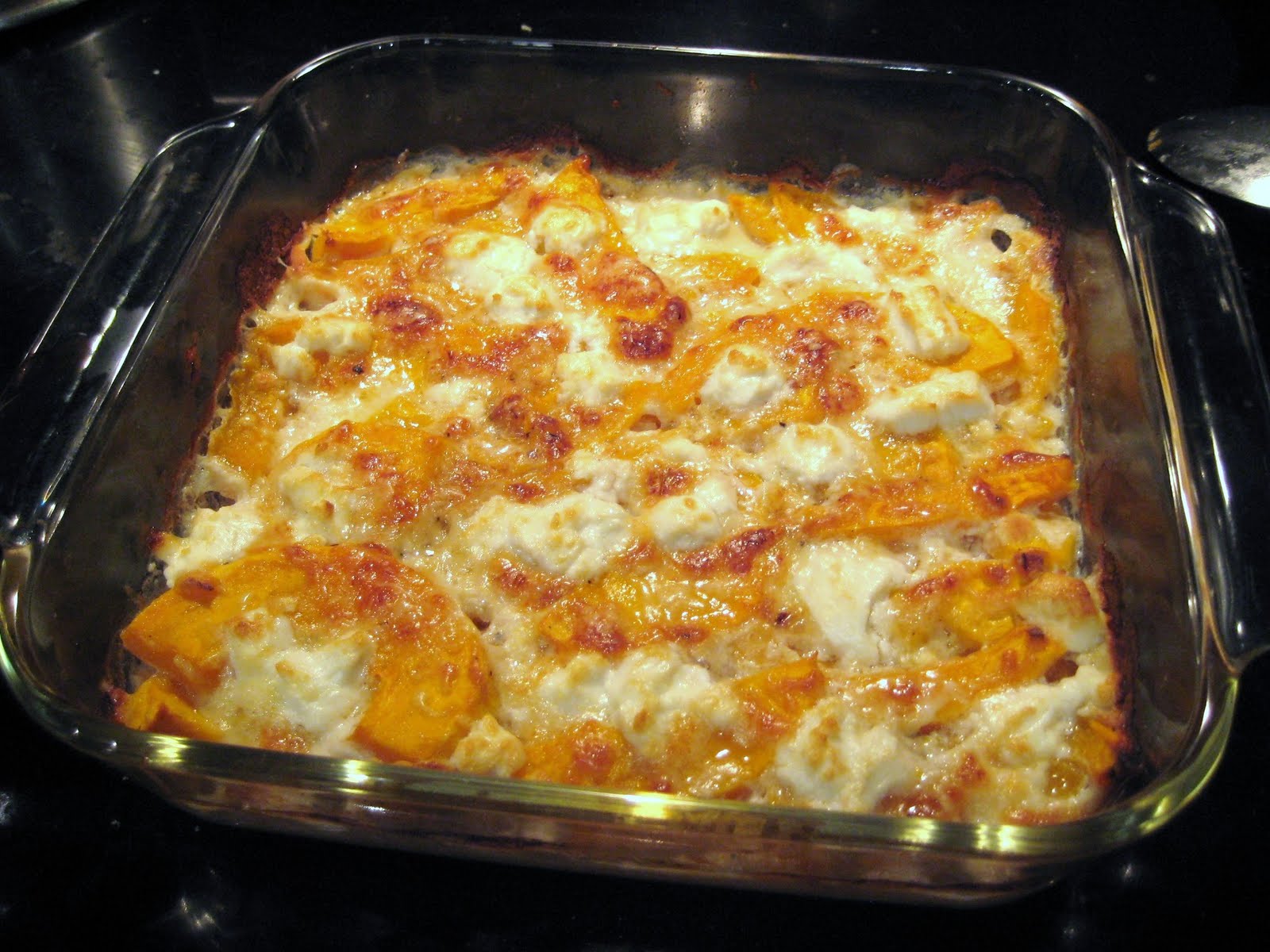 Preheat oven to 375. Toss together squash, shallot, garlic, salt, pepper, and half of fontina cheese, and place in an even layer in an 8x8" casserole dish. Pour milk over squash mixture and press squash down with the back of a spoon. Bake for an hour, pressing squash down every 20 minutes. After an hour, top with remaining fontina and crumble goat cheese over it. Return to oven and bake for 20 more minutes, or until brown and bubbly. Let rest for 5 minutes before serving.